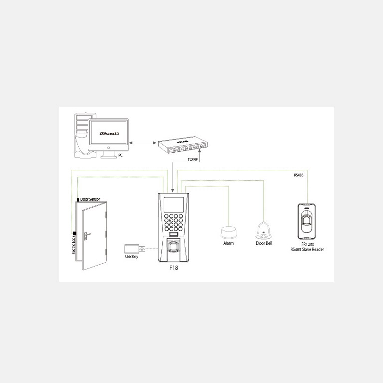 The ZKTeco F18 is a high-performance biometric fingerprint access control device designed for secure and efficient entry management. Powered by an advanced algorithm and a fast 1.2GHz processor, it delivers quick and accurate fingerprint verification. With flexible installation options, TCP/IP connectivity, and compatibility with ZKBio software, the F18 is ideal for businesses requiring reliable and scalable access control solutions.